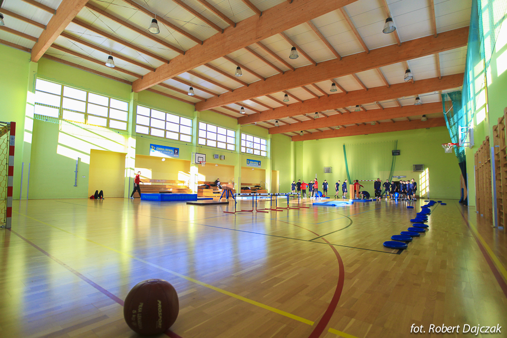 - Nawierzchnia parkietowa o wymiarach 28 x 15 m /możliwość podzielenia hali na dwa niezależne boiska/,
