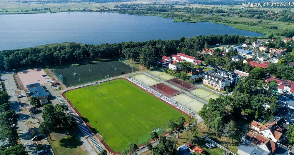 - Pełnowymiarowe boisko do piłki nożnej z naturalną nawierzchnią trawiastą /wymiary 105 x 68 m, oświetlenie, trybuny na 1000 osób/;